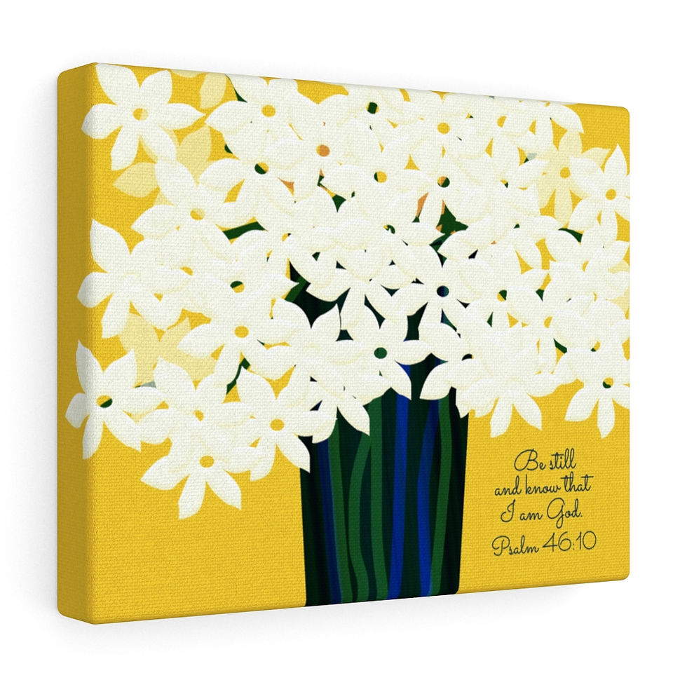 Yellow Canvas Blue Vase of Flowers, Psalm 46:10 Be still and know that I am God